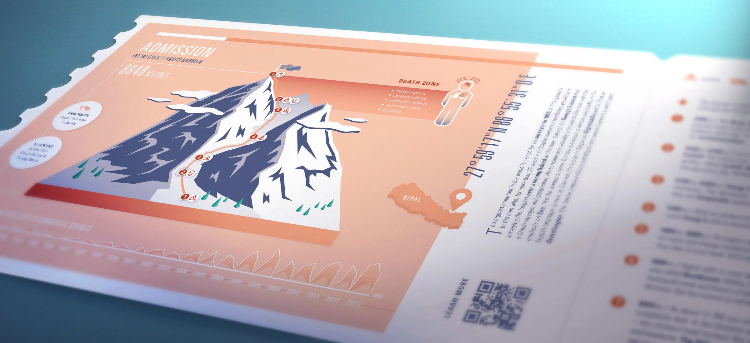 In der Form einer Eintrittskarte und mithilfe einfacher geometrischer Elemente soll diese Infomap Außenstehende dazu einladen, die schwer greifbare Faszination von Achttausendern verständlich zu machen. Der Mount Everest – in Nepal “Sagarmatha” und Tibet “Qomolangma” – ist der höchste Berg der Erde und wurde nach seinem Vermesser George Everest benannt. Wobei sein Vorname eigentlich Eve-rest ausgesprochen wurde, mit einer Betonung auf “Eve” – wie der weibliche Vorname. Dennoch wird er heute fast weltweit “Ever-est” ausgesprochen.